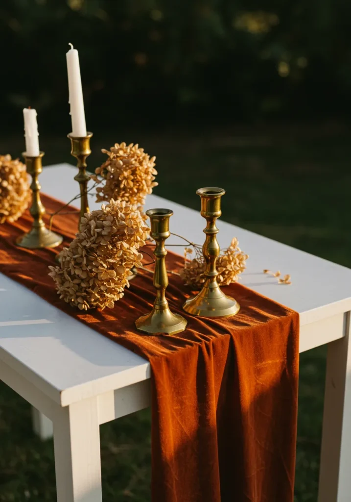 Here’s a setup that leans rich and elegant, pairing a rust-colored velvet runner with brass candleholders and dried hydrangeas. The warm light catches on the metallic tones and creates a soft vintage glow that instantly feels special.