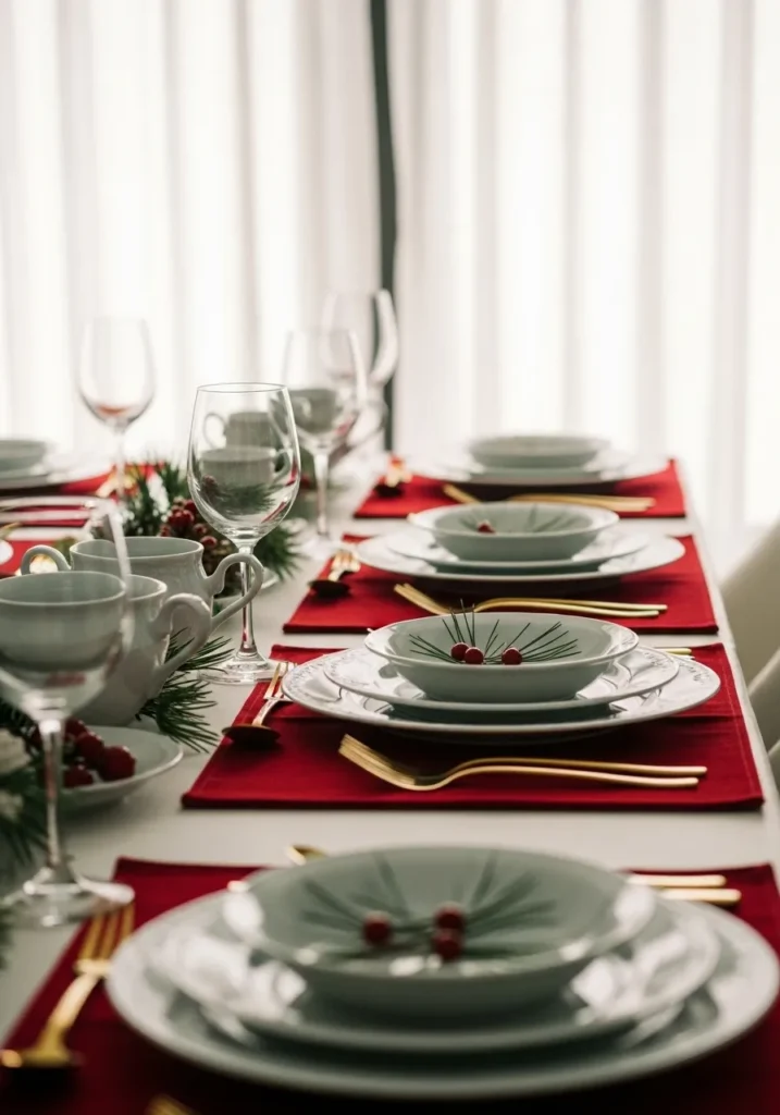 This Christmas table setup is a stunning blend of classic holiday colors. The deep red placemats and gold flatware are the perfect combination, with the white china providing a clean and sophisticated backdrop. Small pine sprigs and red berries are thoughtfully placed on each plate, adding just a touch of natural texture to the formal setting. The simplicity of this design, combined with the elegant colors, creates a timeless and warm holiday vibe.