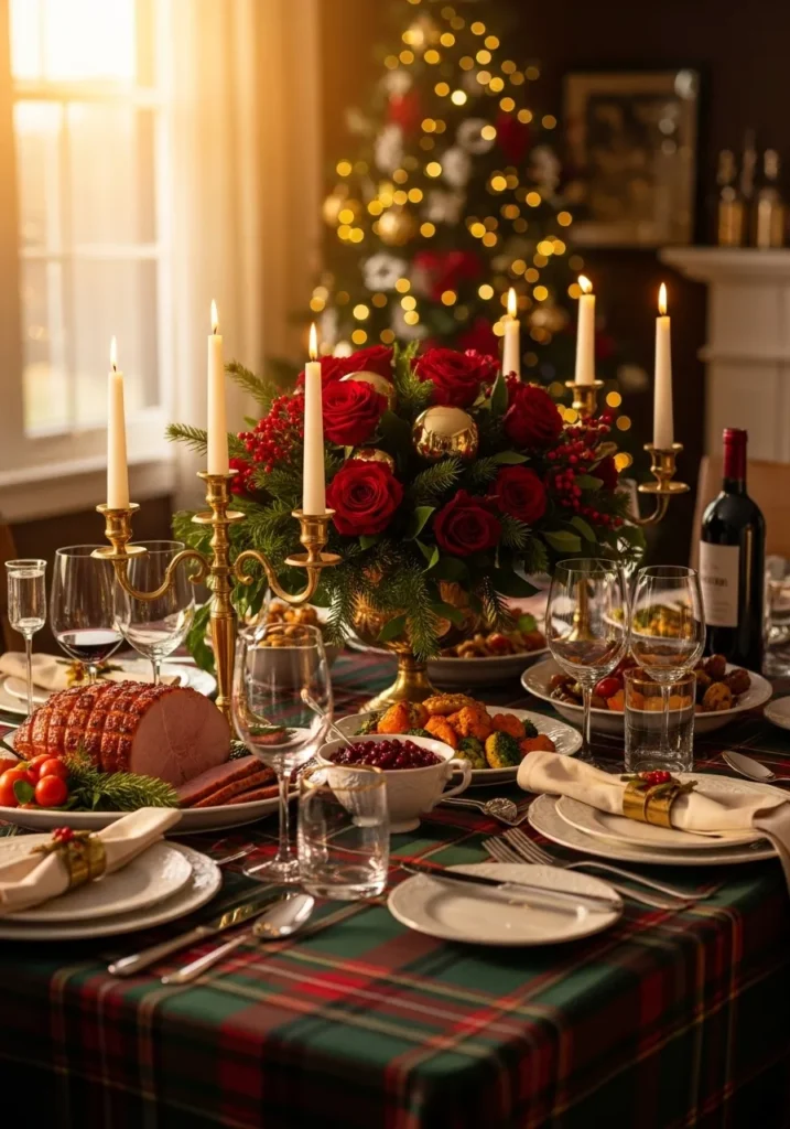This table is a showstopper! The floral centerpiece with red roses gives it a lush, luxurious feel, and the candlelight brings everything to life. The plaid tablecloth is a beautiful contrast to the opulence of the flowers and gold accents, tying everything together in such a lovely way. It’s the ideal setting for a big holiday feast or a special celebration.