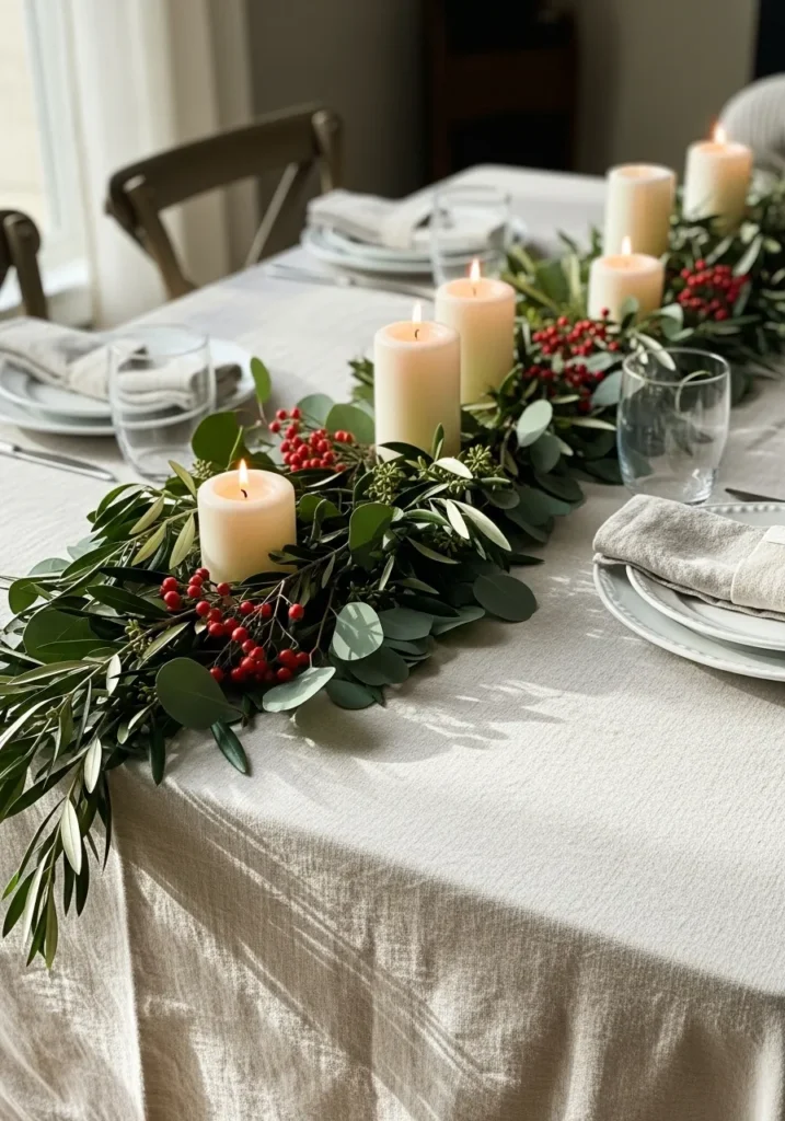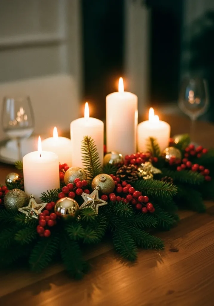 The centerpiece of this table is a gorgeous display of white candles surrounded by gold ornaments and bright red berries. The candles are tall and stand in the center, casting a romantic glow over the meal. The fresh greenery around them contrasts beautifully with the sparkling gold and the bright red berries, creating a striking visual that’s both festive and elegant.