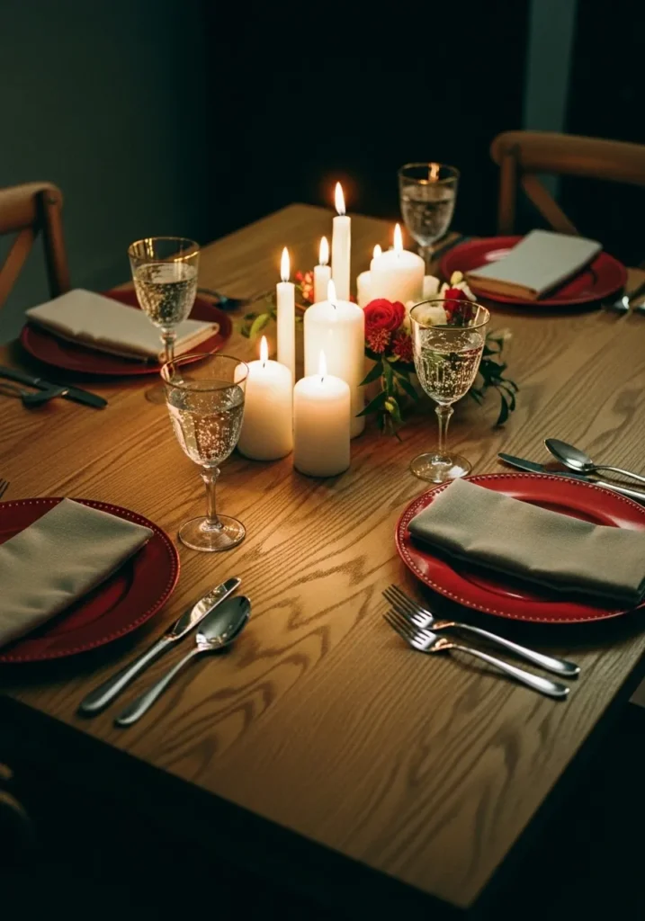 This intimate Christmas table features a cozy and inviting atmosphere with a simple yet elegant design. The flickering candlelight creates a warm and relaxed vibe, while the red dinnerware and delicate floral centerpiece add a touch of holiday cheer. The soft napkins, arranged neatly on each plate, complement the golden flatware and crystal glassware, making it feel both festive and refined. The wooden table gives a rustic touch to the design, balancing the elegance with a cozy, homey feel.
