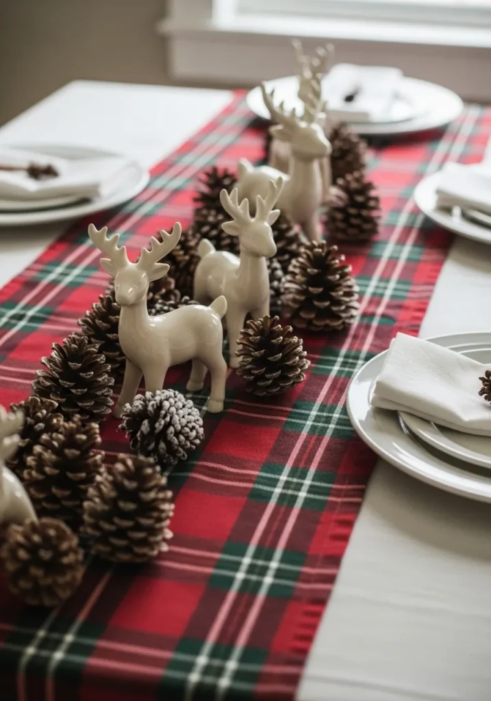 A traditional holiday table layout that combines plaid with sleek modern elements. The red and green plaid tablecloth provides a cozy base, while the clean white plates and silverware create a contemporary contrast. Pinecones, greenery, and small ceramic reindeer add texture and a playful nod to classic holiday décor.