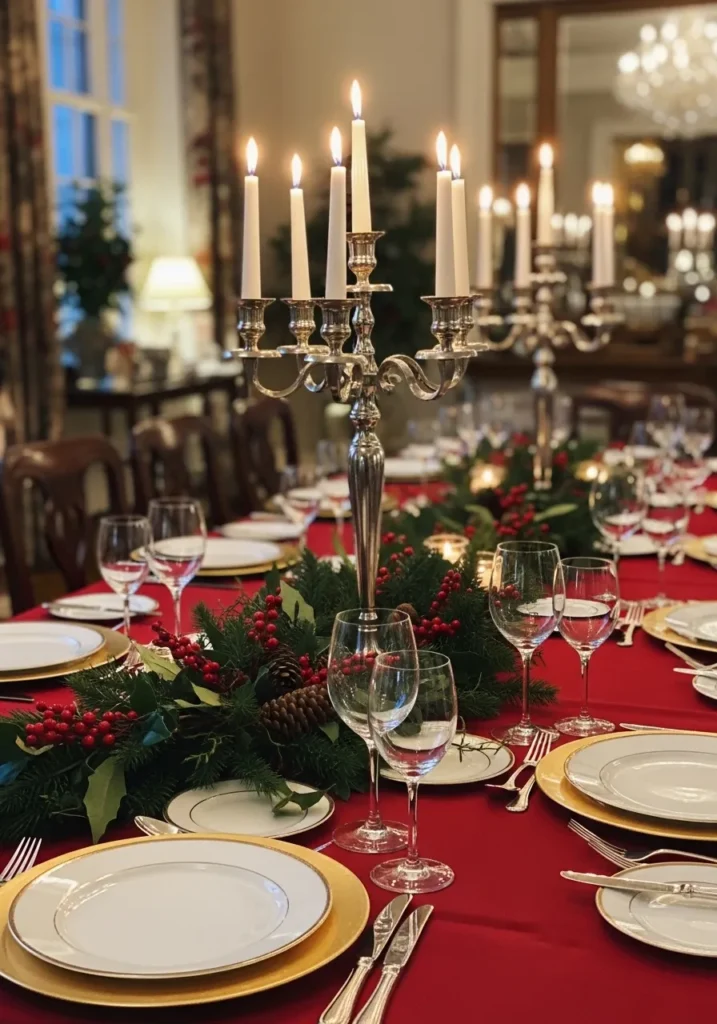 This table setting feels like something straight out of a timeless holiday movie. A rich red tablecloth sets the mood, while the elegant silver candelabras bring that magical glow that makes everyone look extra lovely in candlelight. Lush greenery with pinecones and red berries runs along the center, perfectly balancing natural warmth with a sense of luxury. Gold-rimmed plates and crystal glasses complete the look, creating an atmosphere that’s both classic and totally festive.