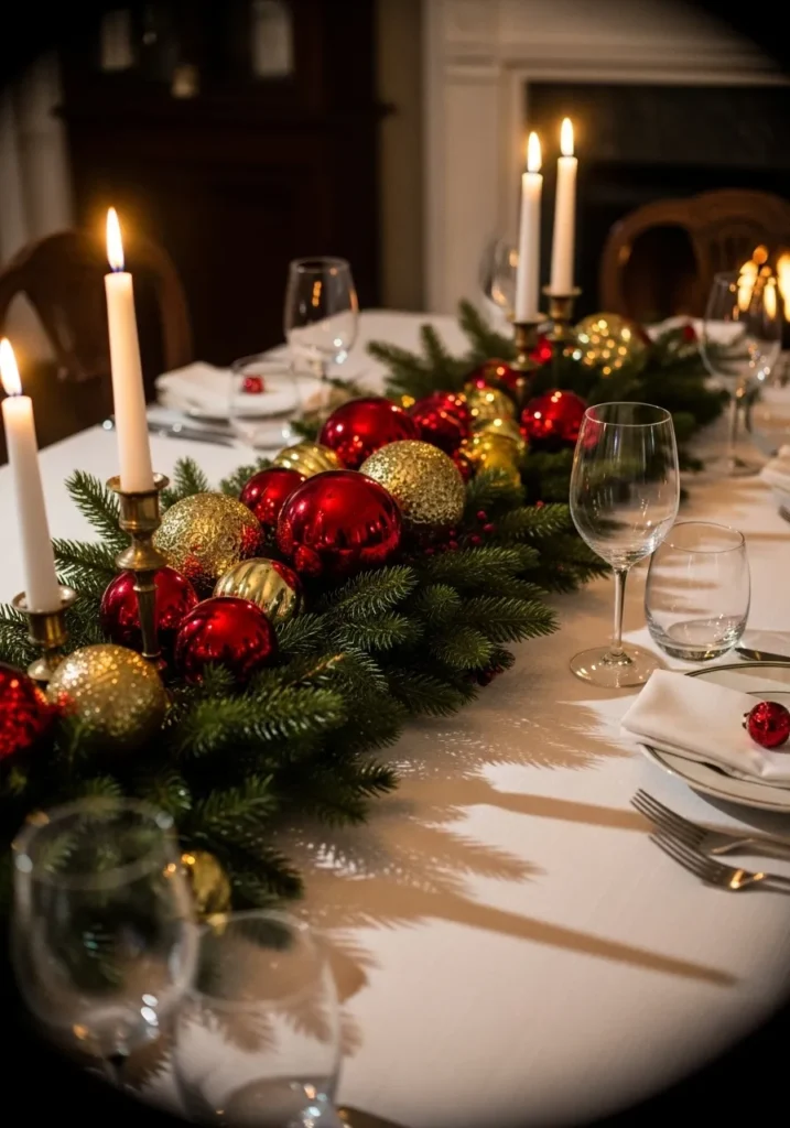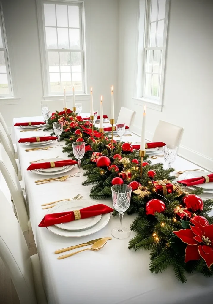 This Christmas table is the perfect picture of timeless holiday beauty. A lush garland of evergreen branches runs through the center, dotted with glittering red and gold ornaments that catch the light just right. Tall white candles in brass holders add a soft, romantic glow that dances across the crisp white tablecloth. Each place setting feels refined and classic, complete with delicate glassware and neatly folded napkins topped with tiny ornaments for that extra festive touch.