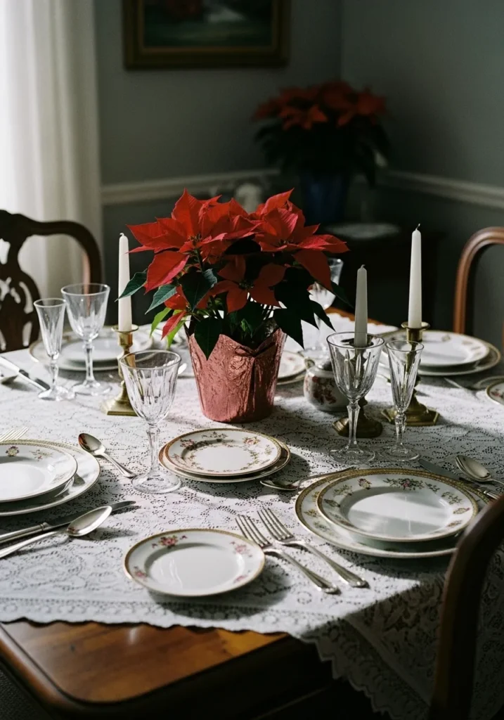 I adore how this table feels so personal, almost like something your grandmother would have proudly set up for Christmas dinner. It’s warm, timeless, and full of heart. The poinsettia steals the spotlight, and I love how its rich red petals contrast beautifully with the soft lace. It’s proof that you don’t need extravagant decorations to make your table feel special—sometimes a touch of tradition is all it takes to make Christmas feel just right.