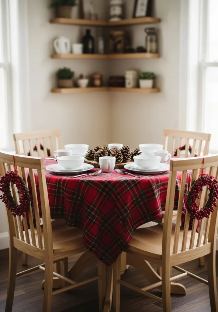 I love how this setup is so unpretentious and charming. It feels so inviting and perfect for a casual family breakfast. The plaid pattern brings in that classic Christmas feeling, but it’s not too overwhelming. This design would make anyone feel at home and ready to enjoy a simple holiday meal.