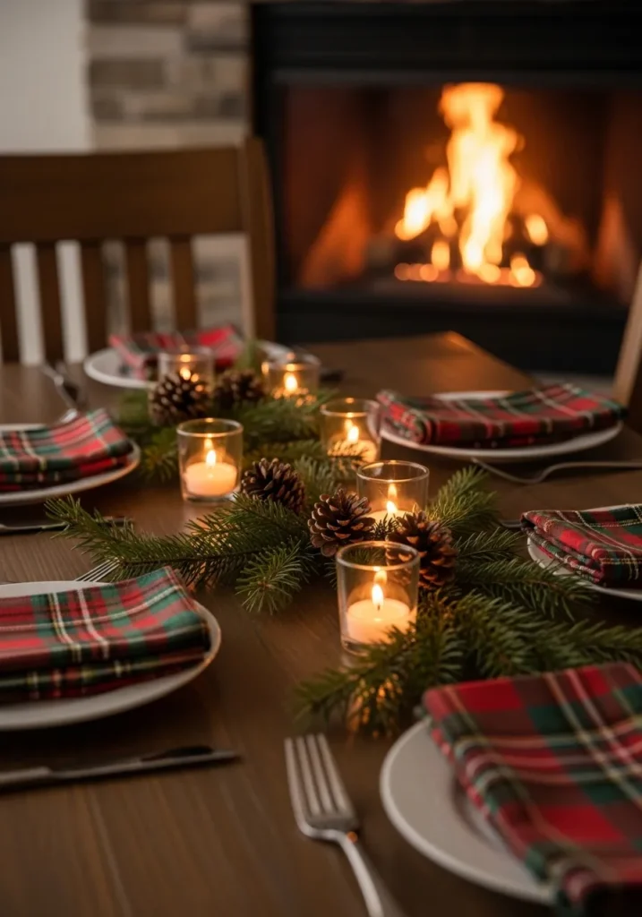 This intimate holiday table is set against the backdrop of a crackling fire, creating a cozy and welcoming atmosphere. The table features rustic plaid napkins and simple glass candleholders surrounded by greenery and pinecones. The warm, flickering lights from the candles and the fire create a soft, romantic glow that’s perfect for a holiday meal.