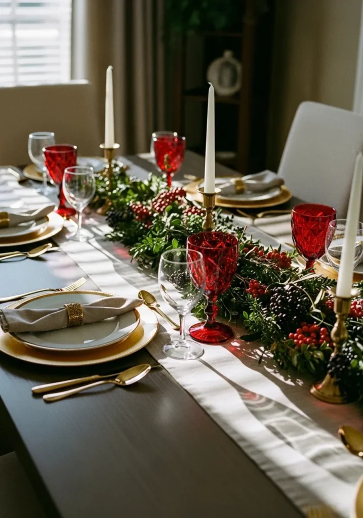 This festive table design combines rich red glassware with the natural beauty of greenery to create an elegant and vibrant holiday setting. The striking red goblets paired with the gold-rimmed plates and white candles elevate the traditional Christmas colors. The fresh garland runs down the center, adding depth and texture to the overall layout, while the long white candles bring a soft and warm glow to the scene.