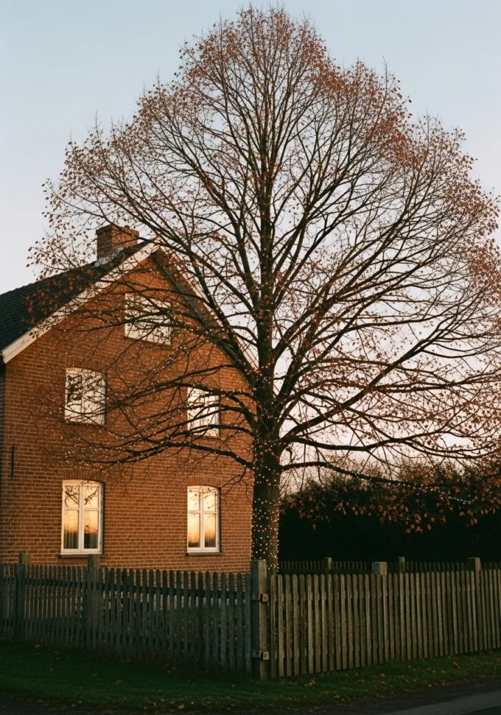 This classic brick house has the kind of charm that never goes out of style. A tall, leafless tree stands proudly in front, wrapped delicately in soft white lights that twinkle just enough to catch the eye without stealing the show. The wooden fence and warm sunset reflection in the windows make the whole scene feel straight out of a nostalgic winter postcard.