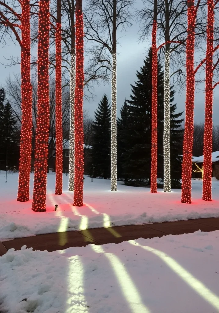 Tall trees wrapped in alternating red and white lights create a playful candy cane effect that turns this snowy yard into a festive wonderland. The bold colors pop beautifully against the wintry backdrop, giving everything a joyful, high-energy holiday vibe.