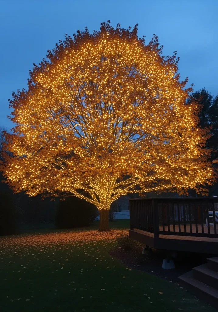 This enormous maple tree is covered in thousands of golden lights, creating a dazzling canopy that lights up the yard like a glowing dome. Each branch sparkles softly, casting a golden reflection on the grass and deck nearby. It’s bold, beautiful, and breathtaking.