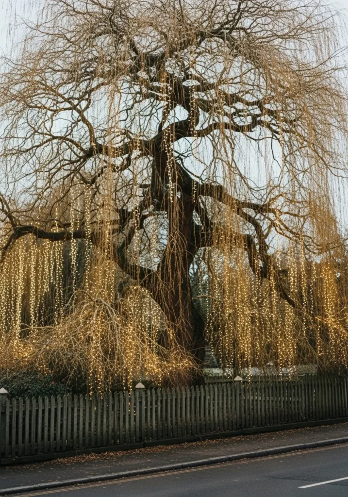 This weeping willow transforms into something out of a fairytale with strings of golden lights cascading gracefully from its long, sweeping branches. The soft glow against the delicate twigs creates a dreamy, enchanted atmosphere that feels both romantic and serene.