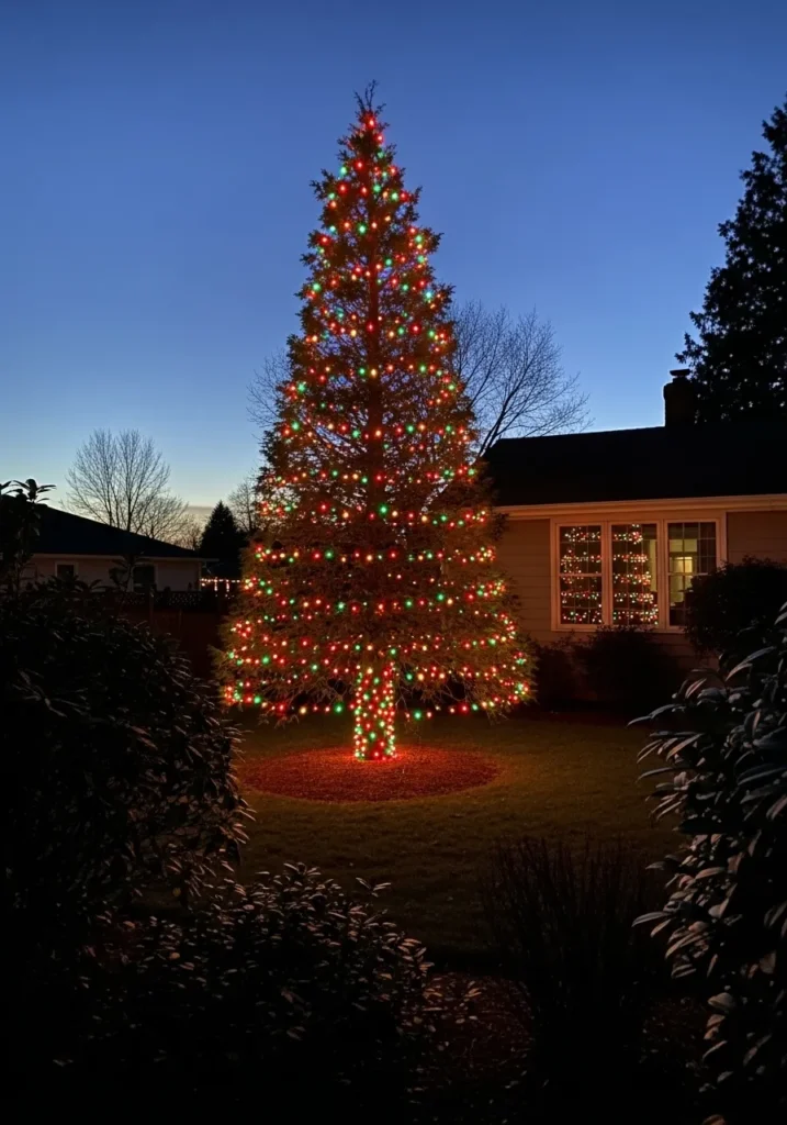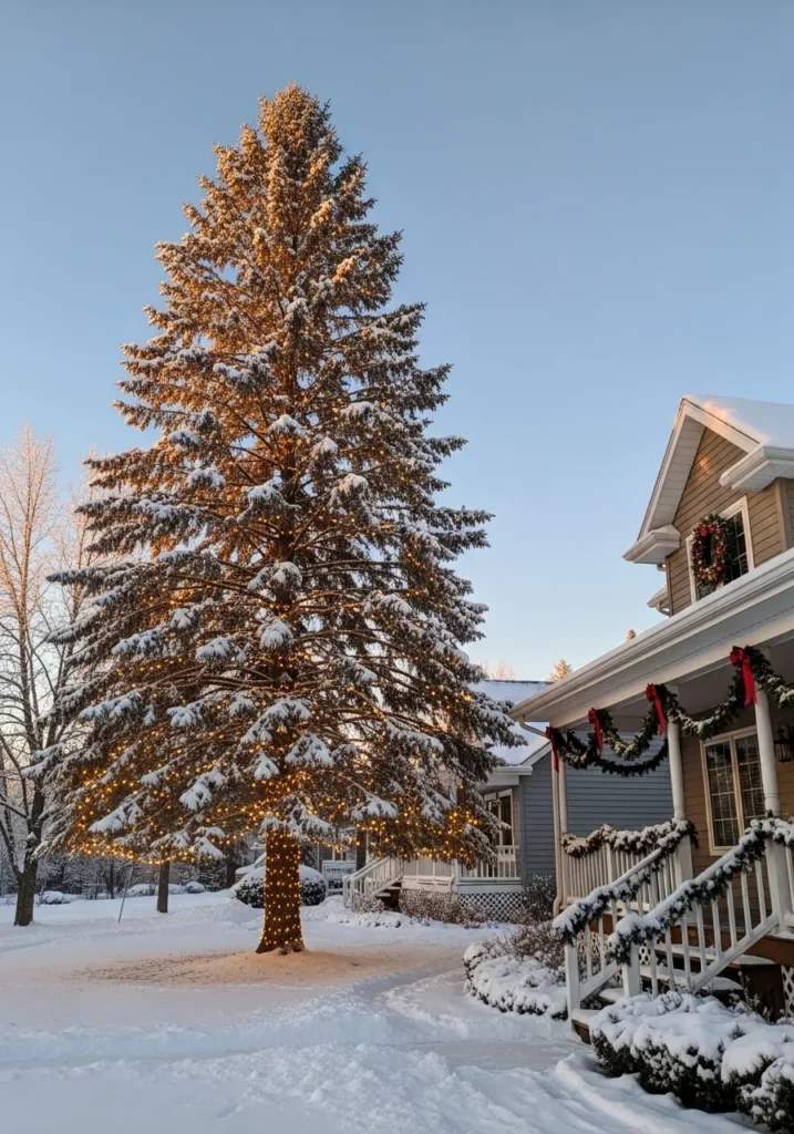 This tall snow-covered pine tree sparkles beside a charming home decorated with wreaths and garlands. The golden lights woven through its branches shimmer softly against the pale blue winter sky, creating a picture-perfect holiday moment right in the front yard.