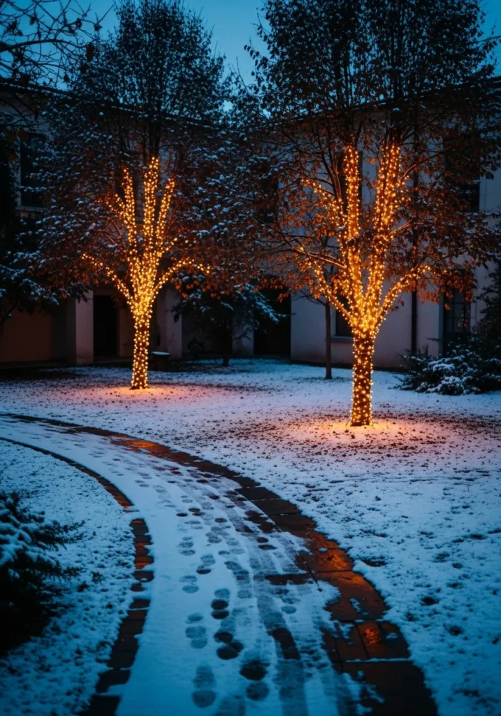 Two glowing trees brighten up a snow-dusted courtyard, their trunks wrapped tightly in golden lights. The gentle glow spills across the walkway, lighting up every footprint with a cozy warmth that feels inviting and peaceful.