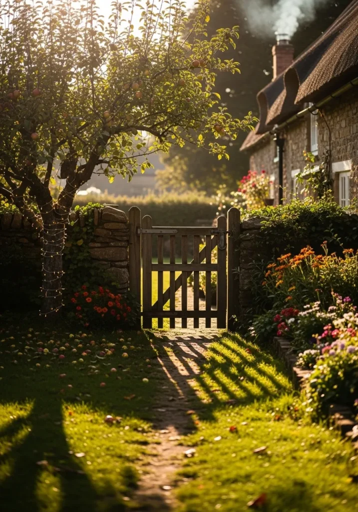 This quaint countryside cottage looks straight out of a storybook. A small apple tree beside the wooden gate is gently wrapped in fairy lights, glowing softly in the golden afternoon light. The lush garden and stone walls make everything feel timeless and cozy.