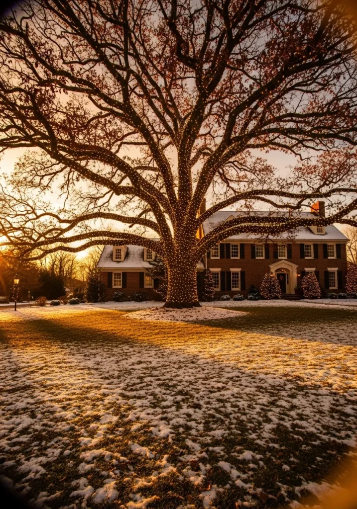 A massive oak tree spreads wide across a snowy lawn, covered from trunk to branch in tiny golden lights. The setting sun casts a warm glow over the house behind it, blending natural light with the twinkle of the bulbs for the ultimate holiday showstopper.