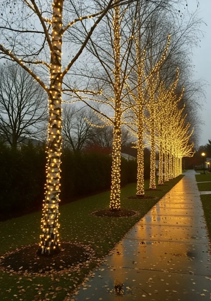 A line of birch trees wrapped in golden fairy lights transforms an ordinary walkway into a glowing tunnel of holiday warmth. The reflections on the wet pavement create a dreamy shimmer that feels like something you’d see in a cozy Christmas movie scene right before the snow starts to fall.