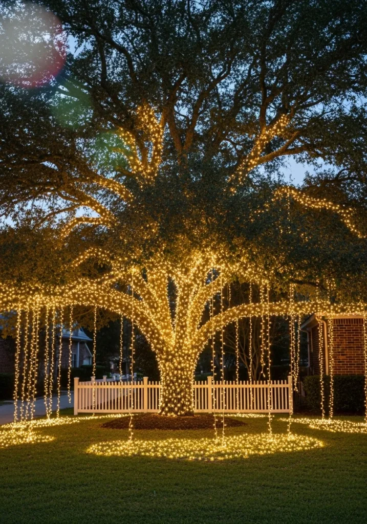 This grand oak is wrapped in thousands of golden lights, with strands cascading from its branches like glowing ribbons of warmth. The soft white fence beneath it completes the look, turning the whole yard into a glowing wonderland that feels right out of a festive film.