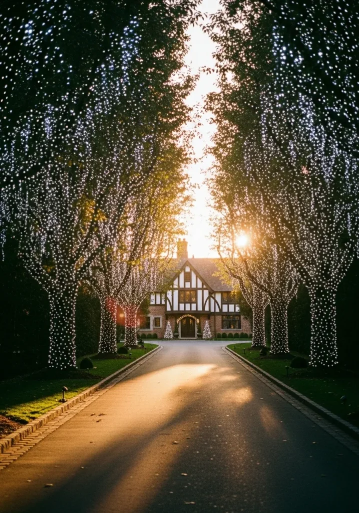 A long driveway lined with tall trees covered in twinkling white lights leads straight to a stunning Tudor-style home. The lights create a sparkling canopy above, catching the last light of sunset and setting the perfect tone for a cozy, movie-worthy evening.