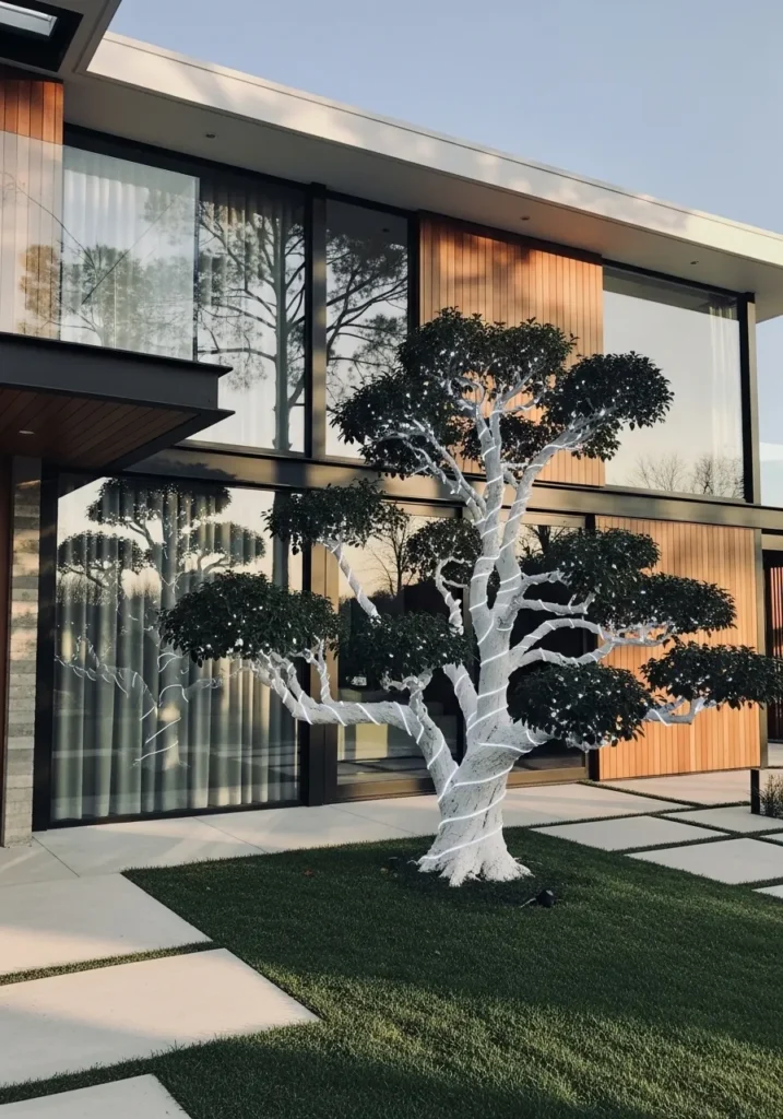 This modern home takes elegance to another level with its clean lines, glass walls, and wood accents. The sculptural tree in front, wrapped tightly in soft white lights, adds a perfect contrast to the home’s sleek design. It’s simple yet bold, creating a glowing focal point that ties the whole space together beautifully.