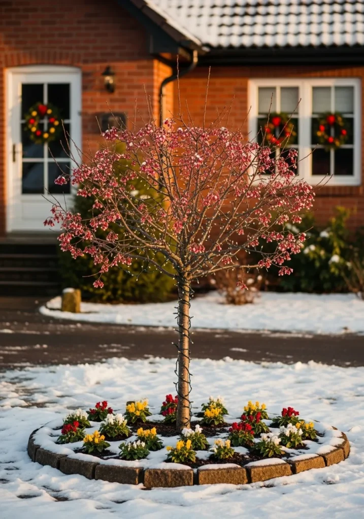 A petite tree framed by colorful winter flowers and dusted with snow brings instant charm to this cozy brick home. The delicate string of lights around the trunk adds a gentle shimmer that feels warm and welcoming, especially against the crisp winter background.