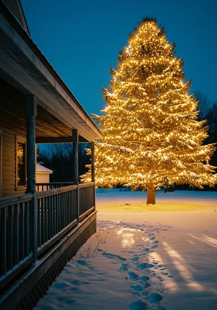 A towering pine tree wrapped in layers of golden lights glows brightly beside a rustic farmhouse porch. The snow-covered ground reflects the warm shimmer, casting a soft golden hue that feels comforting and nostalgic. It’s the kind of glow that makes you want to step outside just to admire it.