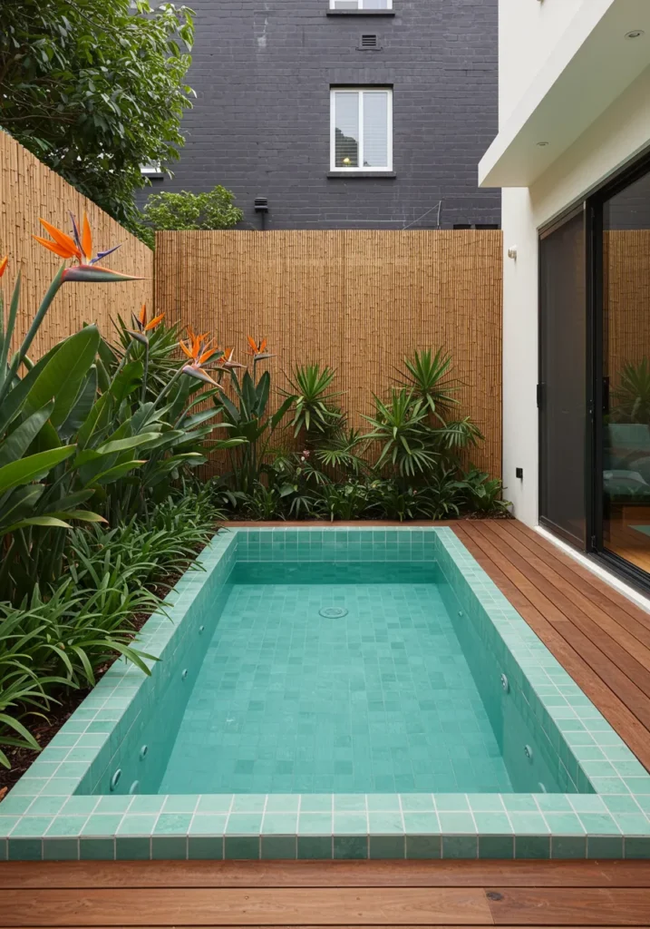 This backyard might be compact, but it knows exactly what it’s doing. The stunning square plunge pool is tiled in fresh emerald green, nestled against warm timber decking that gives the whole space a spa-like feel. Lush tropical greenery frames one side, with bird of paradise flowers showing off their vibrant orange blooms. The bamboo-style privacy screen adds a breezy, island vibe, and the glass sliding doors open right into the water’s glow. Everything feels tight-knit, but intentional and serene.
