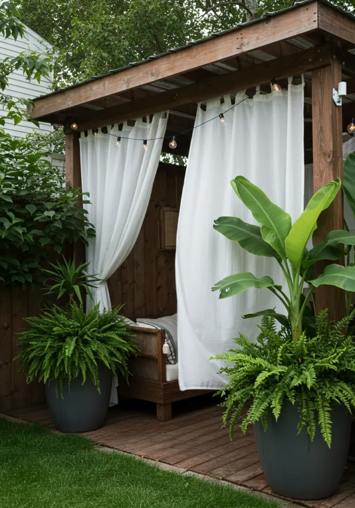 This sweet little corner of the yard feels like something you’d stumble upon at a boutique resort. A wooden cabana is dressed with soft white curtains that sway gently with the breeze, creating the perfect little cocoon of calm. Inside, a cushioned daybed invites you to stretch out and do absolutely nothing. Potted tropical plants like banana leaves and ferns add that lush, leafy texture on either side, and the string lights up top make it feel magical after sunset.