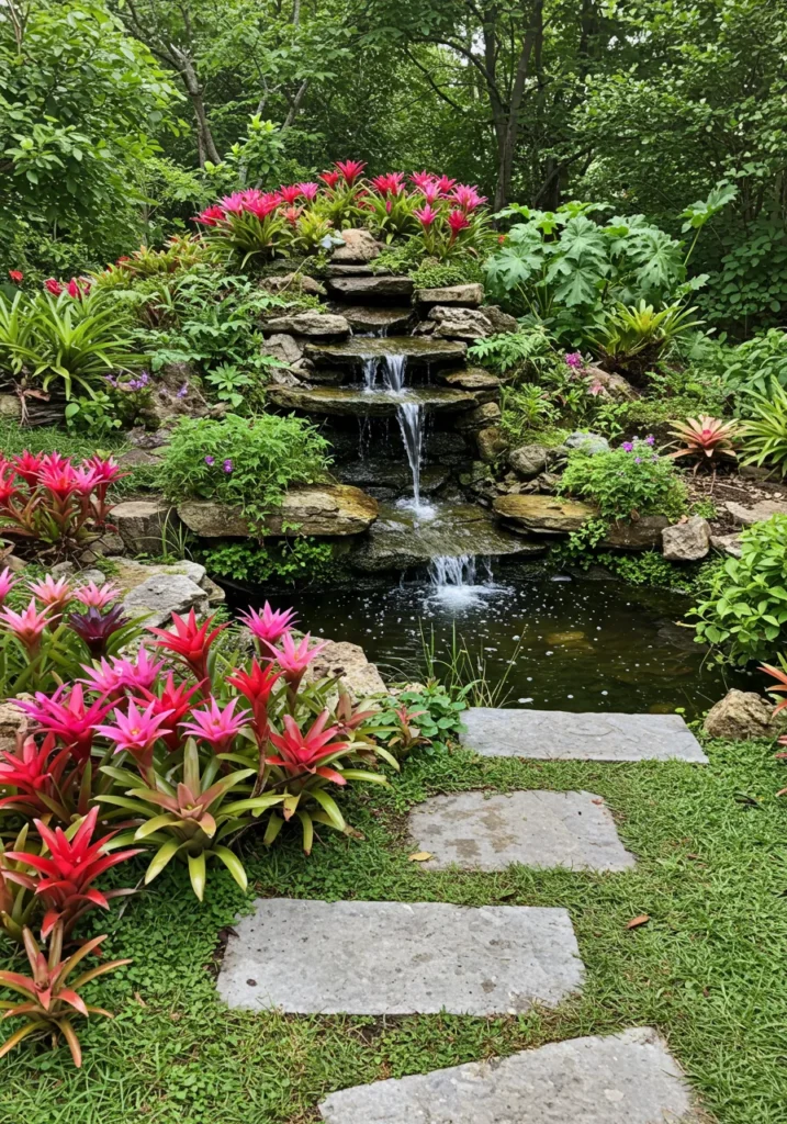 This backyard waterfall is straight-up enchanting. A layered rock formation creates a soft, cascading stream that trickles down into a peaceful pond, all surrounded by bold tropical greenery and bursts of bromeliads in every shade of hot pink. The stone path leading up feels like it’s guiding you into some hidden oasis, and the bubbling sound of the water just ties everything together in the most soothing way.