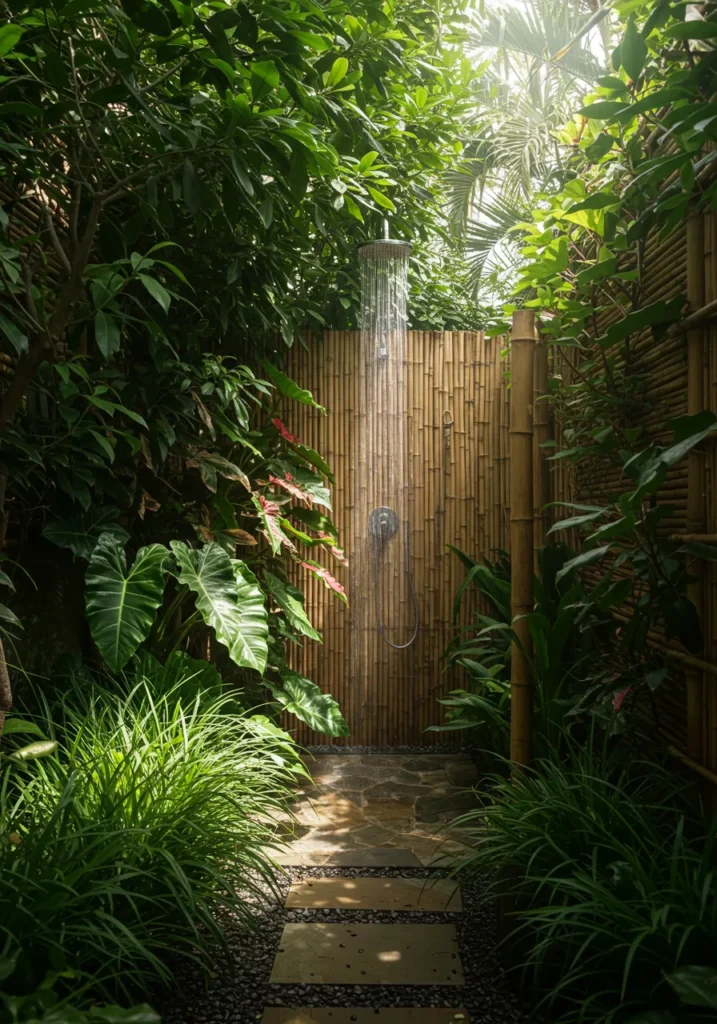 Hidden Outdoor Shower with Bamboo and Lush Tropical Greenery