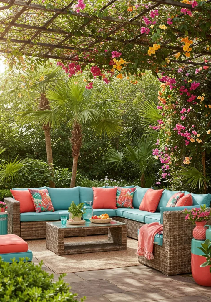 This backyard lounge area is basically summer in a photo. The rattan-style sectional is dressed up in bright aqua and coral cushions, paired with tropical print pillows that just scream vacation mode. Overhead, a rustic pergola drips with bougainvillea in every pink, orange, and sunshine-yellow shade imaginable. Palm trees and lush greenery round out the scene, making this spot feel like the happiest corner of the tropics—right at home.