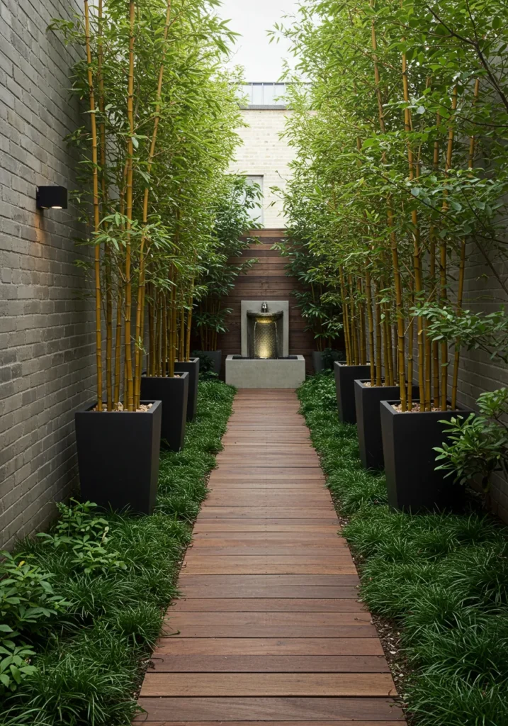This narrow garden is the definition of calm and collected. A smooth wooden walkway stretches through rows of tall golden bamboo planted in sleek black containers, guiding your eye straight to the elegant wall fountain at the end. The greenery along the edges adds softness, while the bamboo sways just enough to whisper you into relaxation. Everything feels balanced and serene, like the garden equivalent of a deep breath.