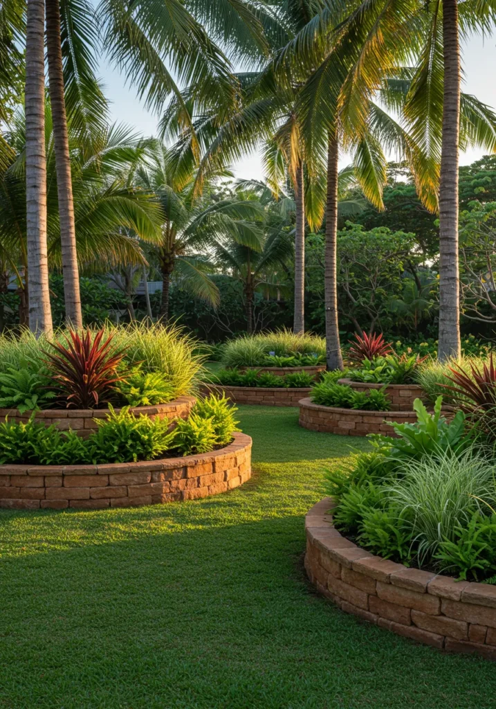 This backyard is giving tropical garden goals. Raised circular planters made of warm-toned stone are filled to the brim with vibrant greenery—think ferns, ornamental grasses, and burgundy ti plants for that spicy pop of color. The perfectly mowed lawn ties everything together, while tall palm trees sway gently overhead and cast dappled light across the entire space. Everything feels fresh, intentional, and totally postcard-worthy.