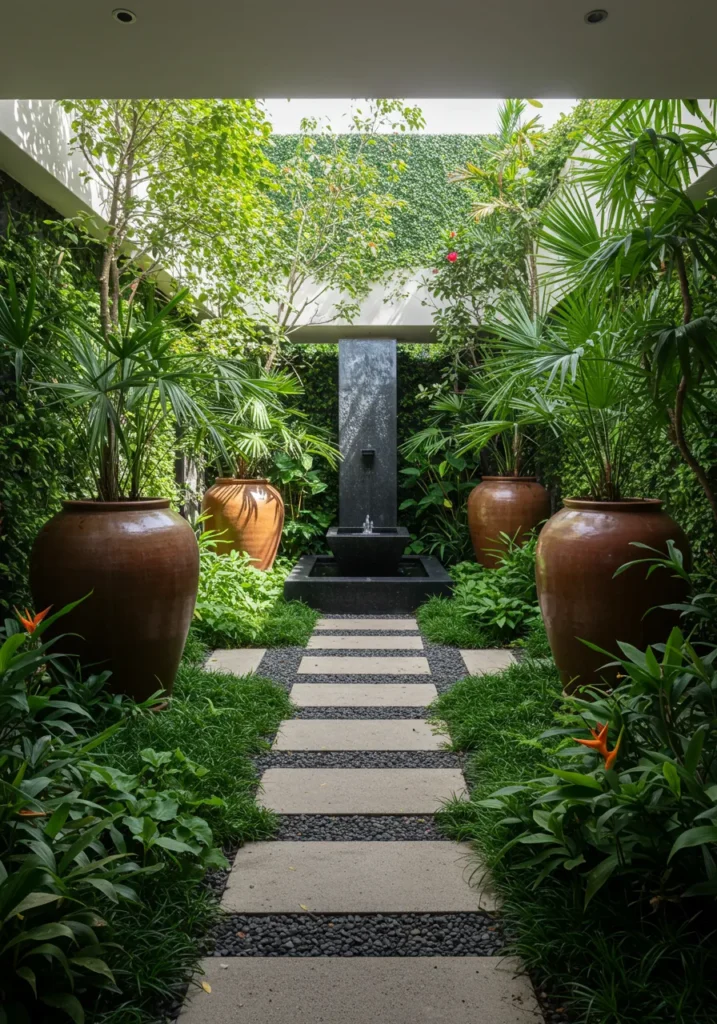 This courtyard feels like your own private tropical gallery. A straight path of modern stepping stones leads through a soft jungle of green ground cover, flanked by oversized terracotta planters filled with fan palms and lush tropical foliage. At the very end stands a tall, dark water fountain that gently trickles into a square basin, adding a spa-like soundtrack to the whole space. Walls of greenery climb up around it, creating a perfect blend of calm and lush.