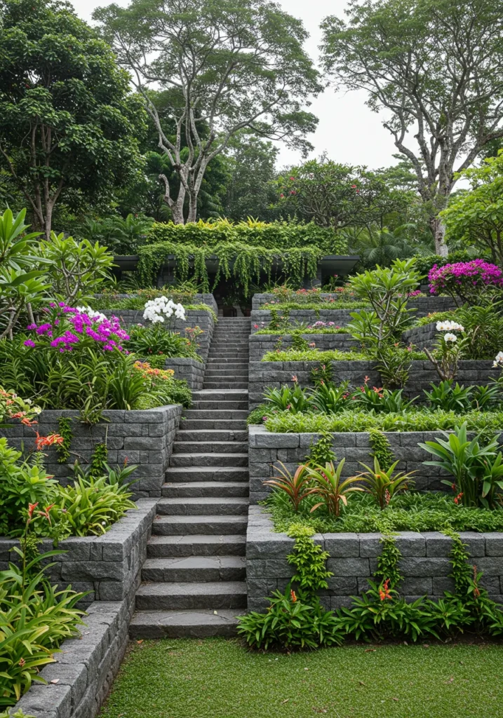 Layered Stone Terrace Garden with Tropical Flowers and Grand Stairs