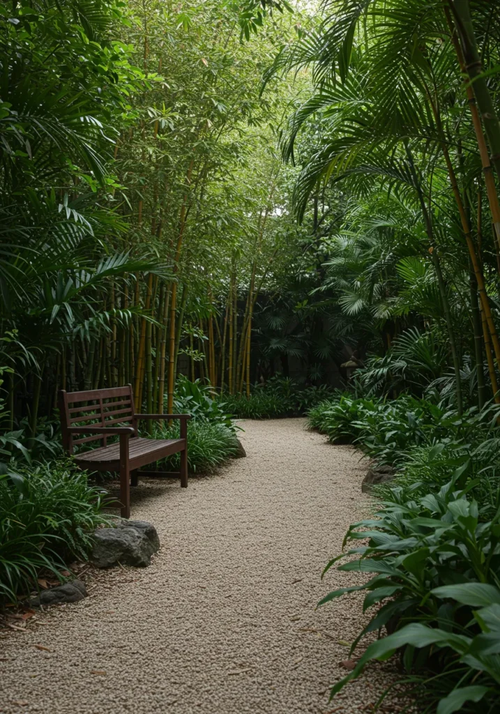 This peaceful garden path is giving serene forest vibes in the best way. A gentle curve of pale gravel winds through dense tropical greenery, with tall golden bamboo and palms towering above to create a natural canopy. Tucked along the edge is a simple wooden bench—just enough to pause and soak it all in. The whole space feels like a secret trail you’d discover on a nature retreat, calm and totally undisturbed.