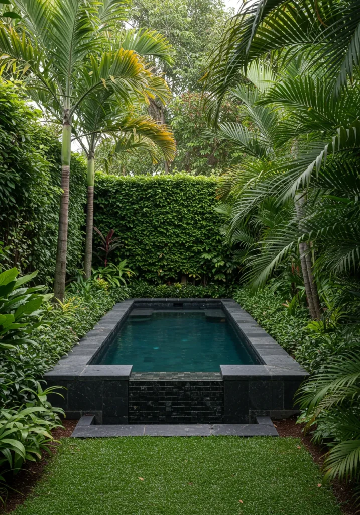 This backyard pool feels like a hidden escape tucked deep inside the jungle. The rectangular plunge pool is wrapped in sleek dark tiles, with clean edges that make the whole setup feel modern and polished. Around it, thick tropical plants and palms grow tall and close, creating a lush green cocoon that feels both private and peaceful. The deep teal water almost disappears into the surrounding foliage, making it feel like your own secret oasis.