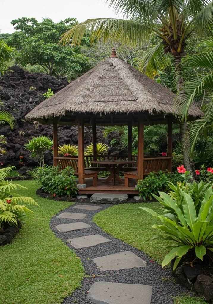This backyard is straight out of a dream. A charming wooden gazebo with a thatched roof sits perfectly tucked into a jungle of vibrant greenery and bold tropical blooms. A curving stone path leads the way, bordered by glossy ferns and hibiscus flowers in full show-off mode. Black lava rocks add that extra touch of island drama while the surrounding palms give this little nook a cocoon-like feel that’s calm, cool, and totally relaxing.