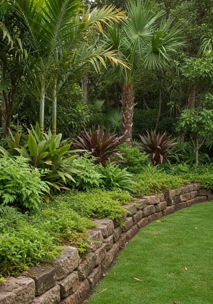 This backyard corner is all about that lush, layered look. A gentle curve of natural stone blocks frames a beautiful mix of tropical plants—from low leafy ground covers to bold red ti plants and baby palms reaching up toward the sun. The greenery is so thick and vibrant, it almost spills over the edge onto the clean, tidy lawn. Everything feels full, healthy, and like it’s thriving with minimal effort.
