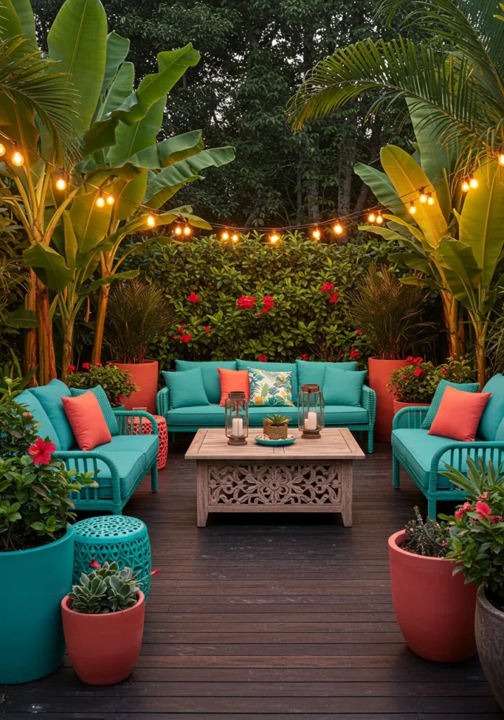 This tropical lounge setup is an absolute mood. Bright teal outdoor sofas are paired with coral pillows and surrounded by banana leaves, red hibiscus, and oversized terracotta pots that make everything pop. The carved wood coffee table adds just the right touch of rustic charm, while string lights overhead create the dreamiest golden glow as the sun goes down. It’s vibrant, cozy, and seriously ready for guests.
