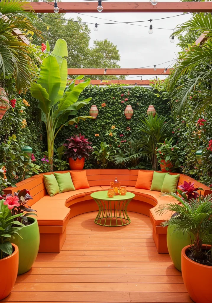 This backyard corner is bursting with personality. The curved built-in bench in bold orange wraps around a lime green table like a cheerful little hug, surrounded by tropical plants in matching citrus-colored pots. String lights and woven lanterns dangle from the pergola beams above, while thick leafy vines climb the walls and explode with colorful flowers. It’s bold, fun, and feels like summer got its own living room.