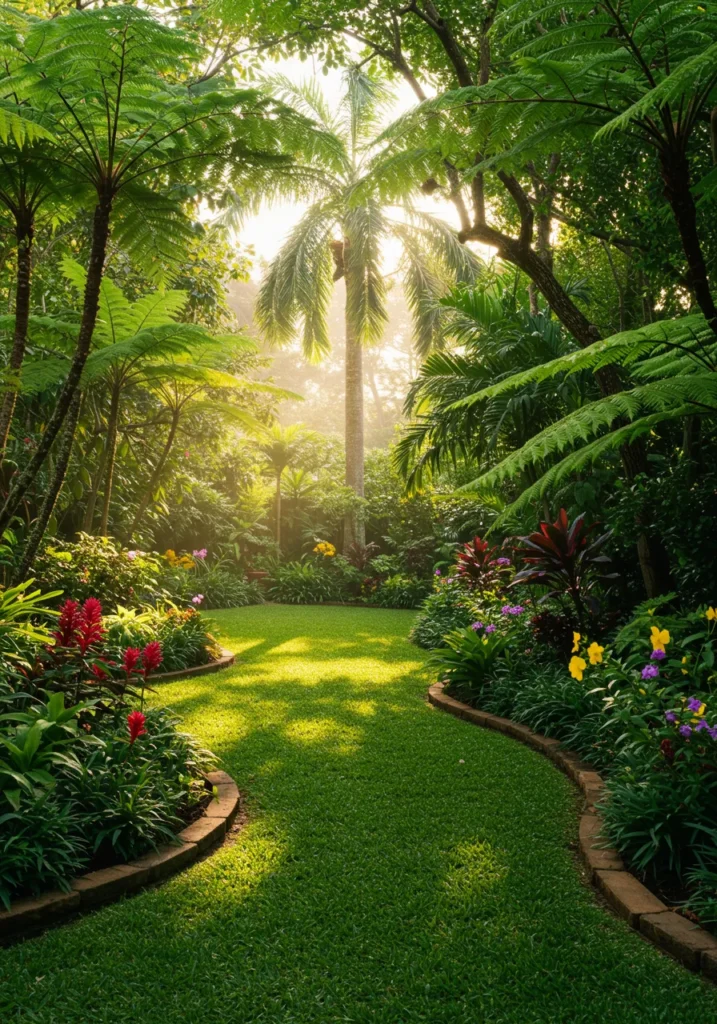 This backyard looks like it belongs in a fairytale set in the tropics. A soft, curving lawn leads your eye through a garden bursting with color—ginger blooms, orchids, and ferns all layered beneath towering palms and giant tree ferns. The morning sun filters gently through the canopy, casting a magical golden light that makes everything feel peaceful and alive. The tidy brick edging gives the whole space a polished finish without taking away from the natural beauty.