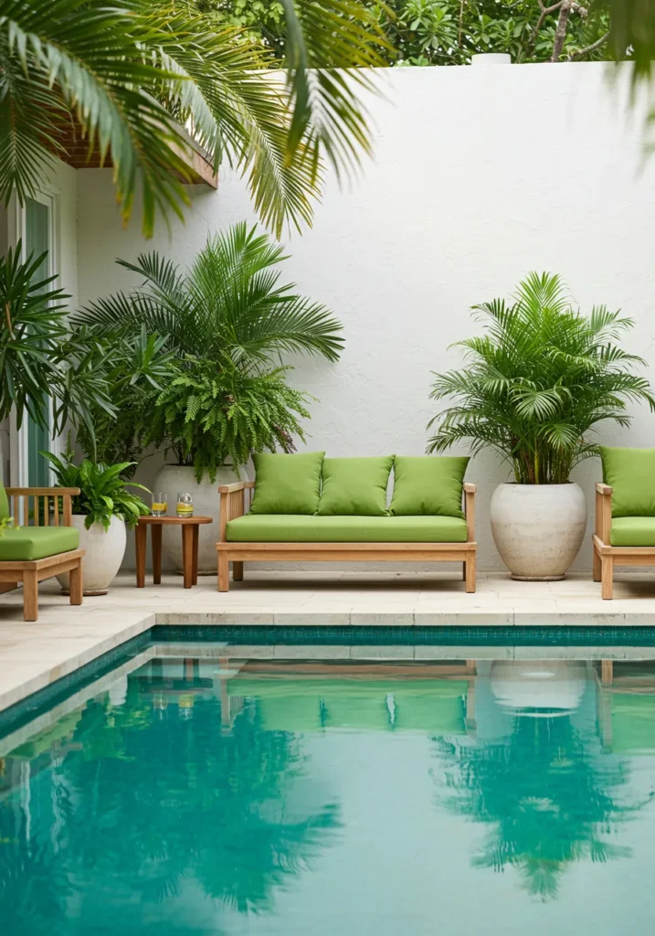 Fresh Poolside Lounge with Green Cushions and Tropical Potted Plants