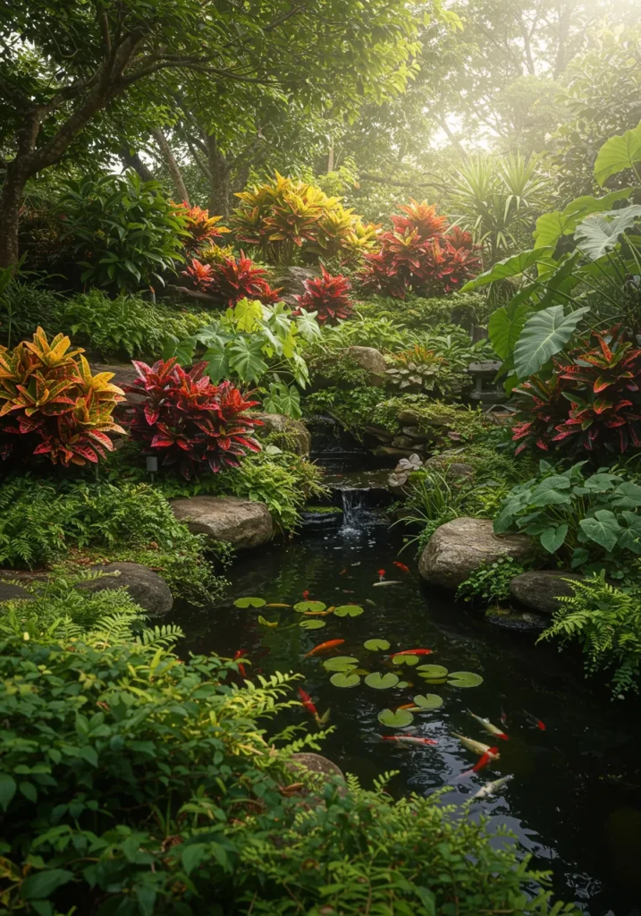 Lush Koi Pond Garden with Bursts of Tropical Color