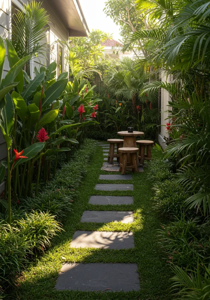 This narrow side yard is working some serious tropical magic. A stepping stone path guides you through walls of lush greenery, with red ginger flowers popping up like nature’s own confetti. At the very end, a rustic wooden table and stools are tucked away in the most charming little nook, completely surrounded by palms and tropical plants. The whole space feels snug and private, like your own hidden café in the middle of a jungle.