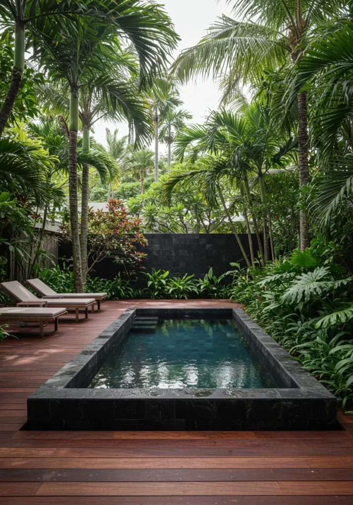 This tropical pool setup is giving major luxury resort energy. A rectangular plunge pool wrapped in smooth dark stone sits perfectly centered in a deep wood deck, surrounded by layers of palm trees and lush green foliage that make you feel instantly hidden away. A pair of loungers off to the side invite you to stretch out and fully unplug, while the dense planting around the edges keeps everything feeling super private and peaceful.