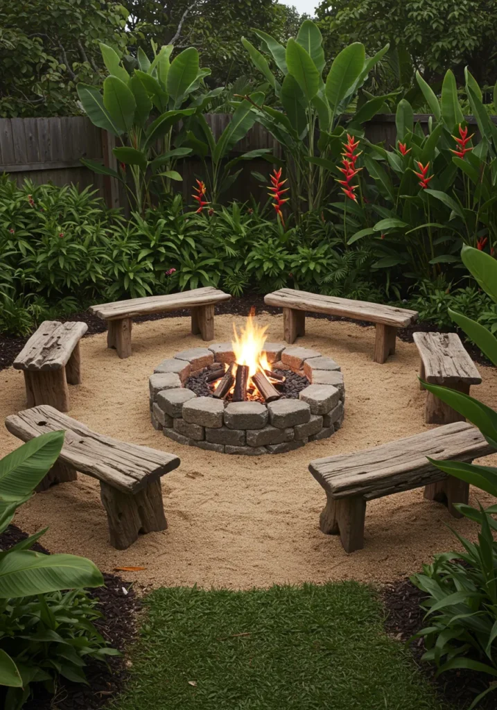 Rustic Fire Pit Circle Surrounded by Tropical Greenery
