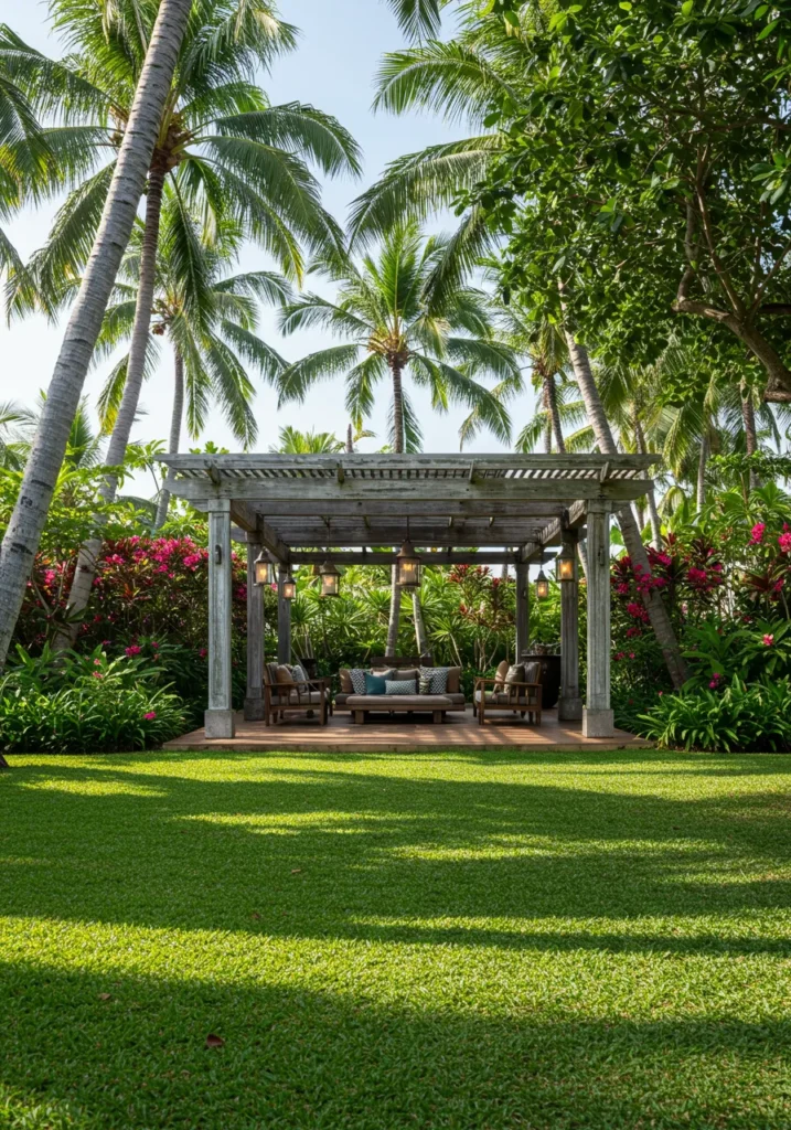 This tropical backyard is living its best resort life. A weathered wood pergola frames a dreamy lounge setup with comfy seating, soft pillows, and lanterns that glow just right when the sun starts to dip. The structure sits neatly on a raised wooden platform, surrounded by perfectly manicured grass and a lush explosion of palms and flowering shrubs. It’s open, breezy, and begging for slow mornings or golden hour cocktails.