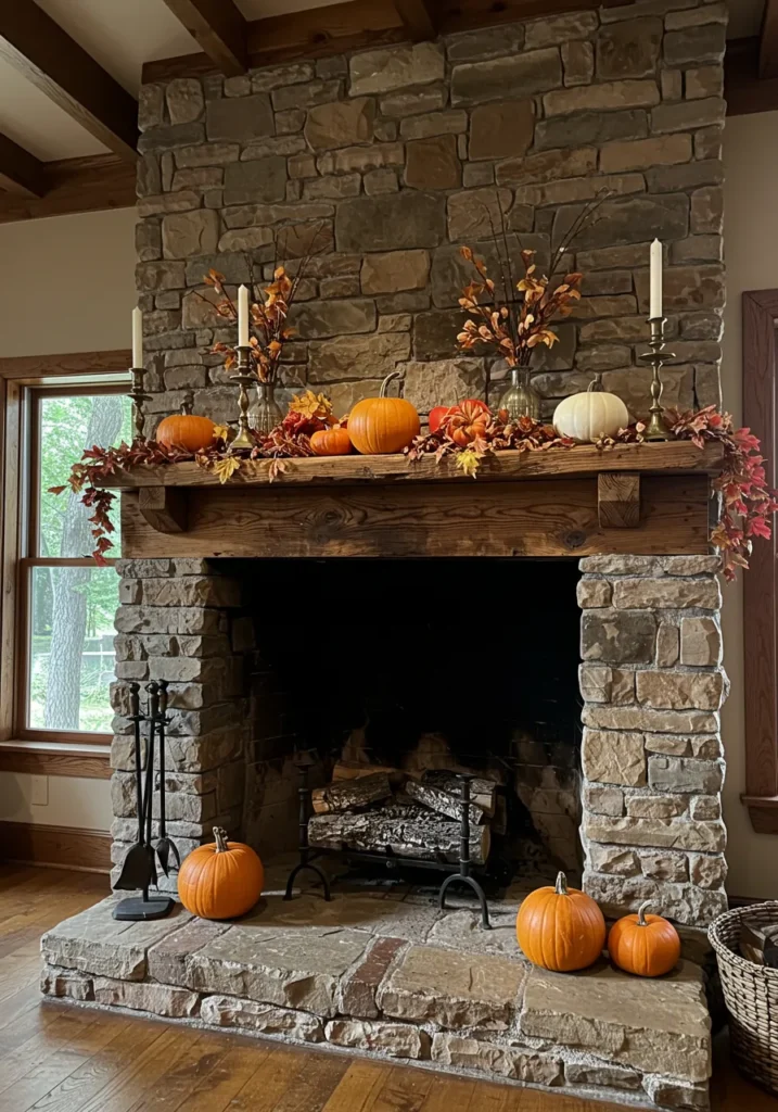 Rustic Stone Mantel With Pumpkin Charm