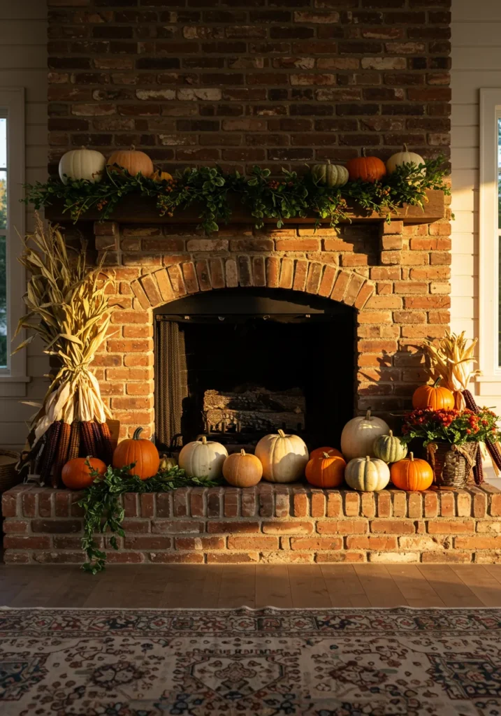 This rustic brick fireplace glows in the soft warmth of the afternoon sun, highlighting pumpkins in every shade of cream and orange. A simple garland of greenery adds a natural touch, while dried corn bundles on each side balance the look with harvest charm. The setup feels effortlessly nostalgic, like a cozy farmhouse scene straight out of a family gathering.